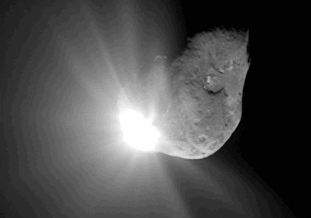 "On July 4, 2005, the Deep Impact space probe successfully [dropped a 60 lb. copper ball which] collided with the comet's nucleus. The impact excavated debris from the interior of the nucleus, forming an impact crater. Photographs taken by the spacecraft showed the comet to be more dusty and less icy than had been expected. The impact generated an unexpectedly large and bright dust cloud, obscuring the view of the impact crater."