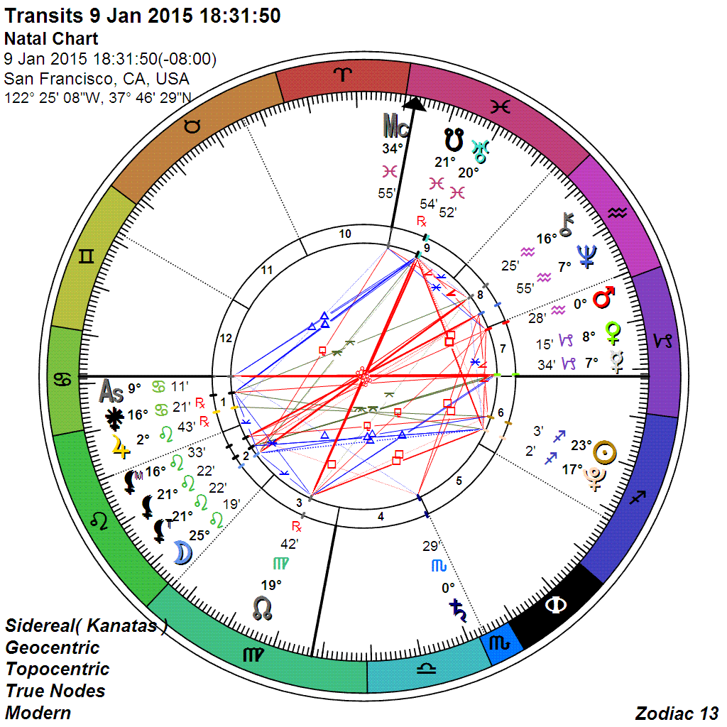 The above chart, drawn for the 23rd of January, shows the predicament: Saturn, newly reformed into a heady brew of irrefutable fact and cold retribution in Scorpio, is in a long term square with Neptune in Aquarius. The battle of these titans can make our ideals of an equitable society and reform seem like childhood fantasies. Saturn in Scorpio means responsibility and restriction involving payment of debts, the BIG reckoning. "The intensity associated with Scorpio and the rigidity of Saturn indicate confrontation with limitations that are imposed by the presence of too much control in some area of their lives, or manipulation in order to gain control." (Saturn in Scorpio)