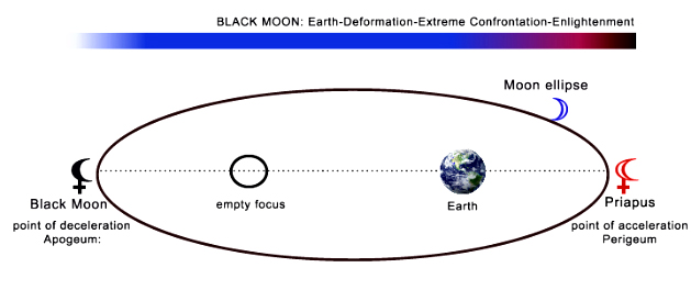 The Black Moon is signified by the empty void in space between our Earth and the Lunar Moons apogee, see map above. I recently read a book by Laura Walker, ‘The Astrology of the black Moon’ Her research has led her to believe that the Black Moon is the essence or phantom left behind by the planet ‘Tiamat’ that was once Earth’s neighbor in our skies. Tiamat’s destruction was the cause of the asteroid belt and formed planets such as Venus and Mercury. The general theory is that Tiamat was destroyed by a natural cosmic catastrophe, such as the theory of our second sun in which most suns in the universe have as a twin, this second sun is often referred to as Nibiru, Tyche, Nemisis, Planet X or Herculobus and has an orbit of around 36,000 years. The bible refers to it as Wormwood. But Laura is more inclined to believe that Tiamat was destroyed and blown to pieces by a Galactic war. But overall she believes that Tiamat’s energy is still apparent and its impression still as strong as it was when in existence.