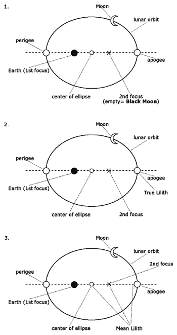 There are 3 "invisible" Liliths in astrology, the "true" Dark Moon Lilith at the apogee, the "Black" Moon Lilith in the void created by the apogee and the derived "Mean" Lilith at the the midpoint of the apogee and the eclipse. Then there is the actual Lilith asteroid, discovered in 1927. There are different opinions on the Lilith Moons! Are they all different quantum mechanical abstracts? Or one and the same but expressed in different ways? I would dare to say that the three points do exist separately, as Lilith throughout history has taken many different forms that represent her dark journey into the grief, the hate and the exile. See the illustrations below for the Liliths determined by mathematical models.